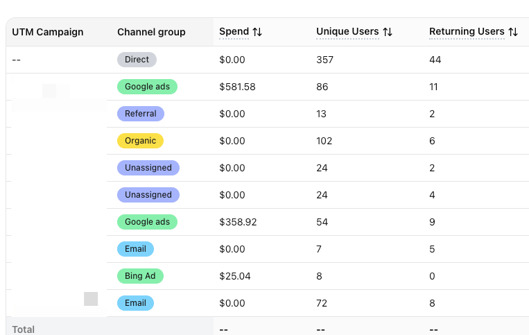 - Returning users helps separate repeat demand from net-new reach.