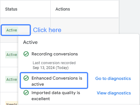 Accept Customer Data Terms in Google Ads. Enable EC on the conversion action and verify diagnostics in the Conversions UI.